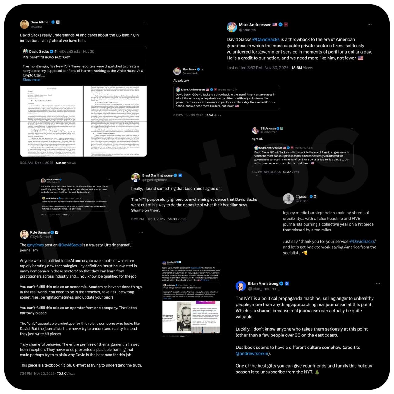 None of them actually disputed the facts in the article. Instead they called it a "hit piece," said Sacks is "selfless," and Brian Armstrong called the NYT "a political propaganda machine”. I mean look at the responses below… seems pretty coordinated to us.
