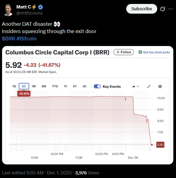 $BRR (Columbus Circle Capital Corp I), the SPAC merging with Anthony Pompliano's ProCap BTC, just tanked nearly half its value in the last month. The stock went from around ten bucks to under six as of this writing. Trading was even halted on November 28th due to volatility.